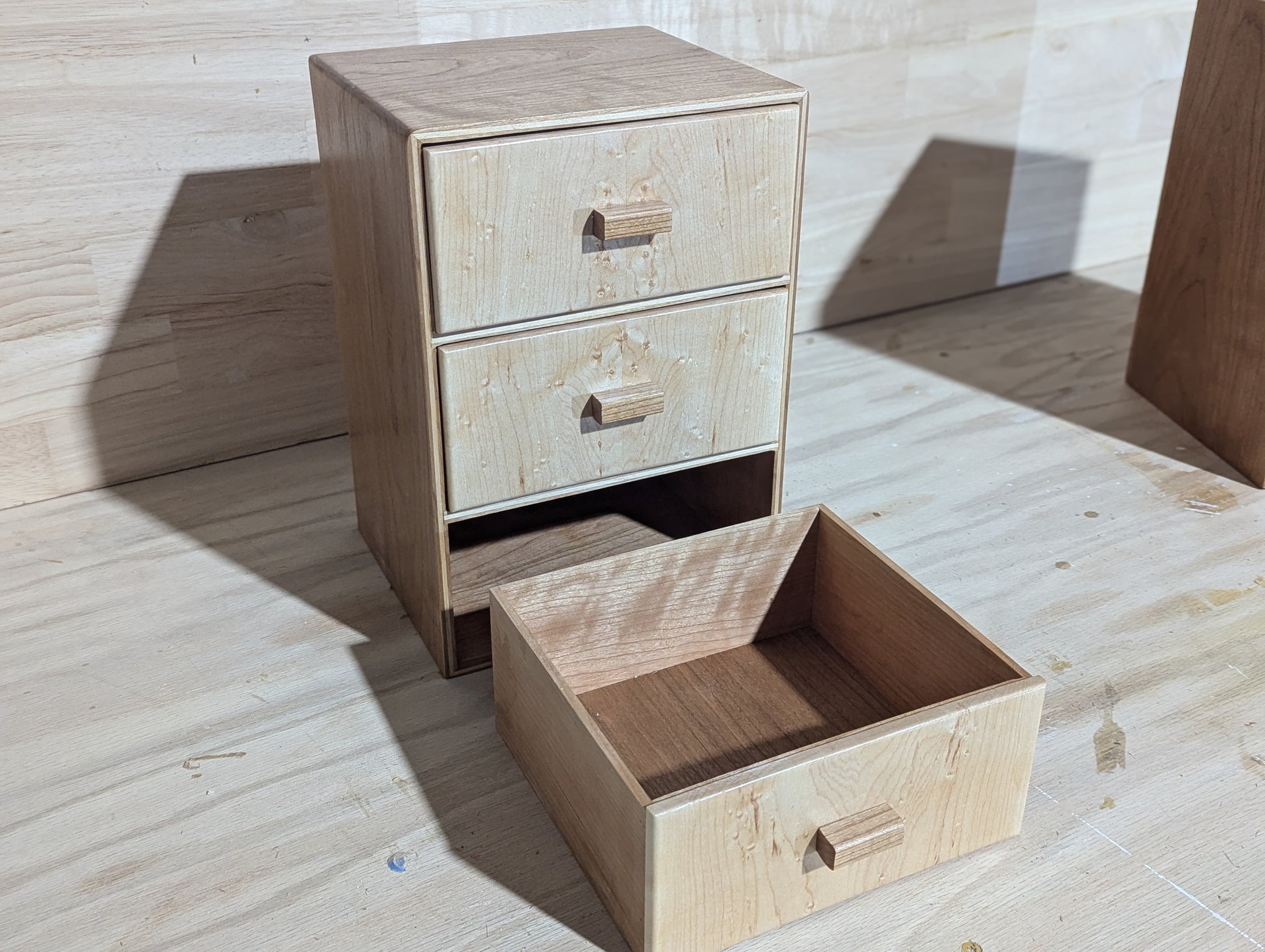 3 drawer jewelry box made out of cherry with a book matched maple front. The total dimensions of the box are 12 inches high, 8.25 inches wide, and 7.25 inches deep.