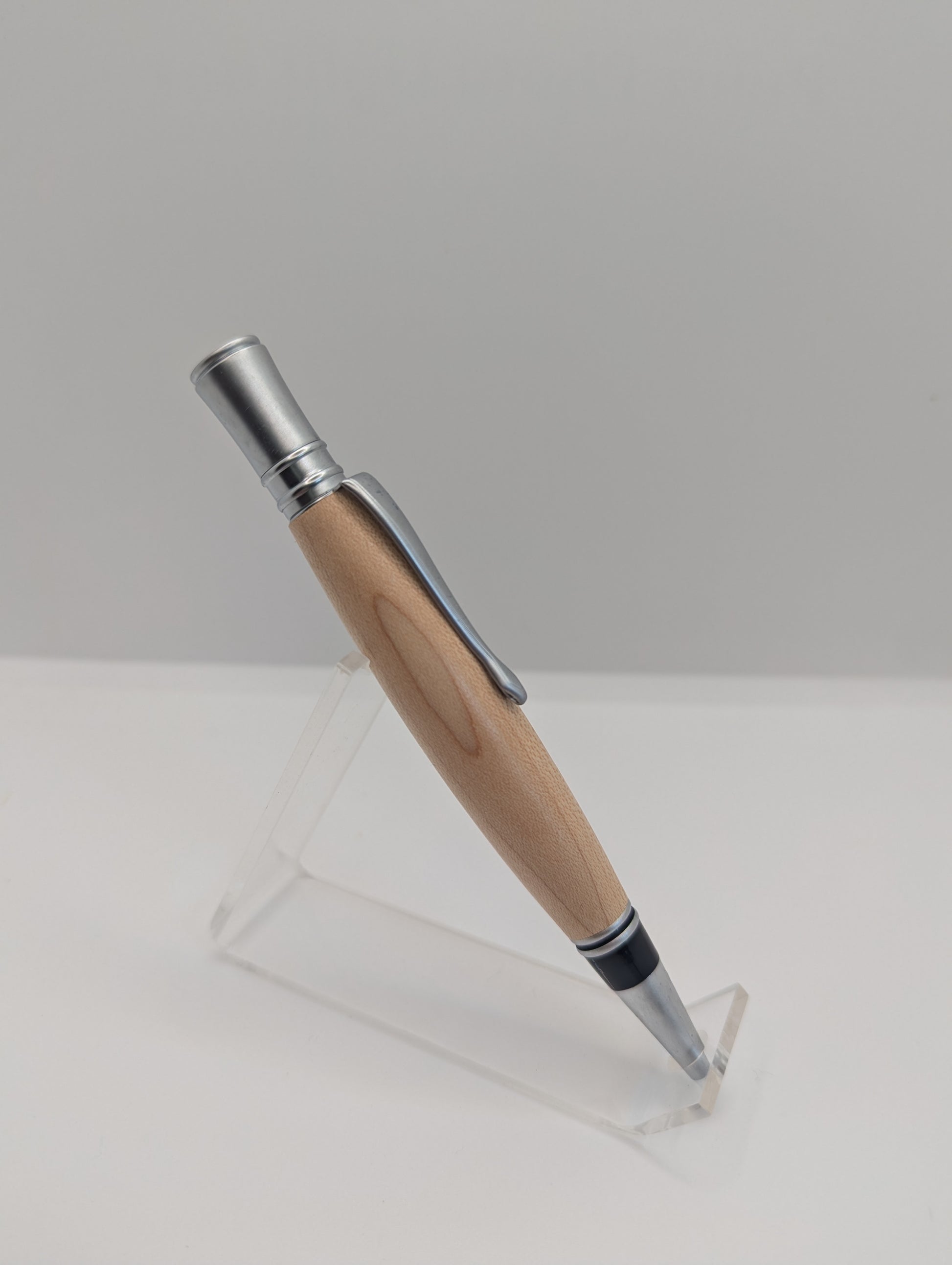 Ballpoint pen with a unique twisting to advance and retract the pen nib. A solid and classy everyday pen. Maple with satin chrome hardware