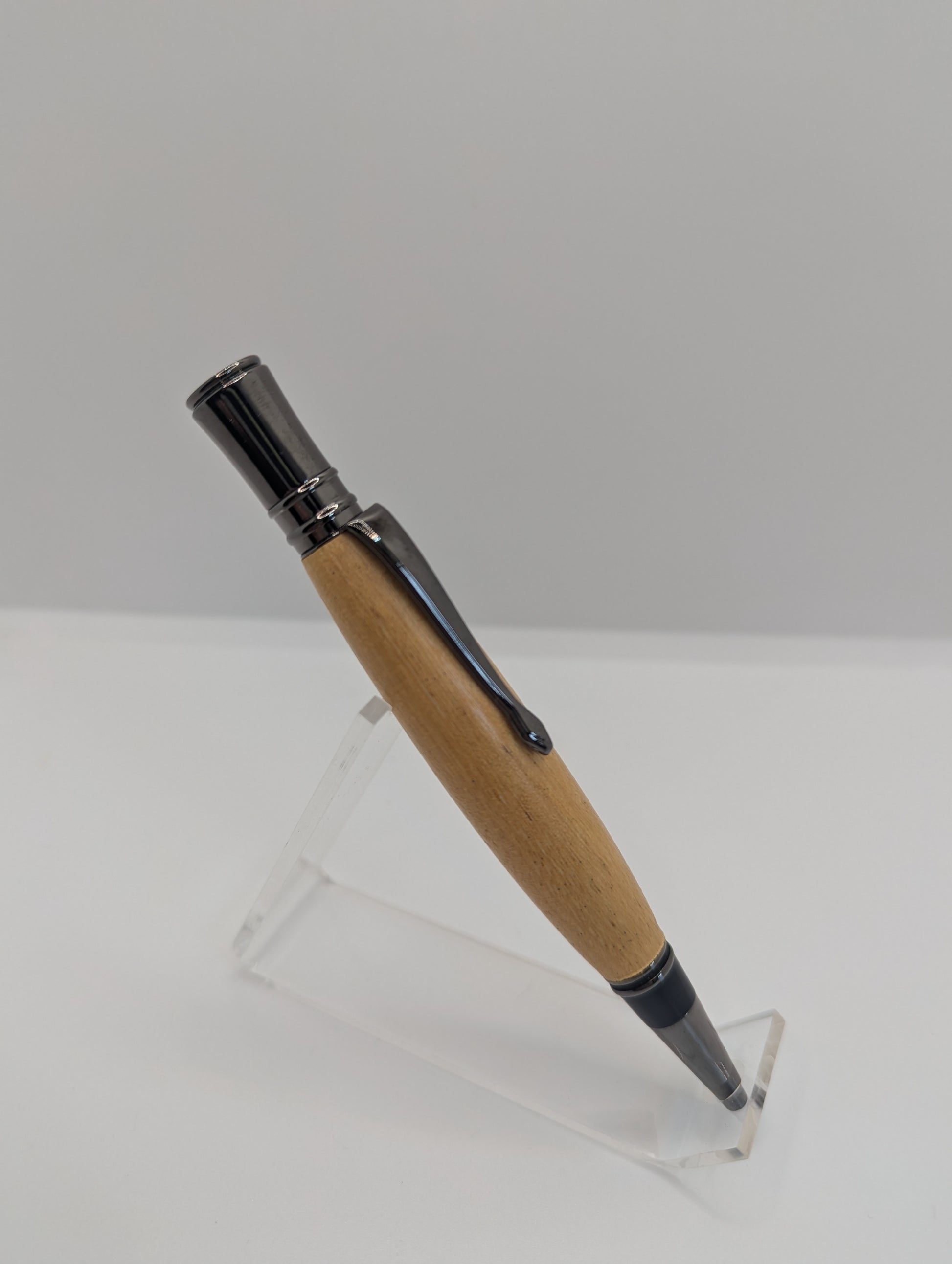 Ballpoint pen with a unique twisting to advance and retract the pen nib. A solid and classy everyday pen. Yellowheart with gunmetal hardware